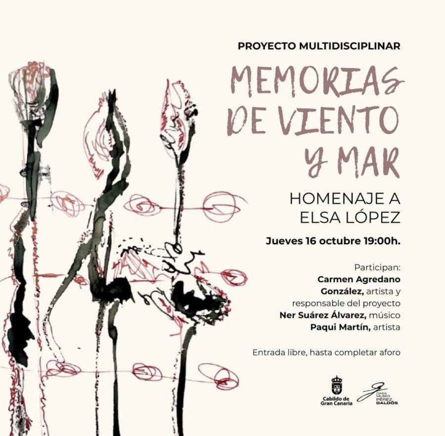 Las Palmas de Gran Canaria, 14 de octubre de 2025- La Casa-Museo Pérez Galdós presenta el día 16 de octubre, a las 19:00 horas, el proyecto multidisciplinar ‘Memorias de viento y mar’, una iniciativa artística dirigida por Carmen Agredano González, que rinde homenaje a la reconocida editora, poeta y narradora Elsa López. Junto a Agredano, participarán en el acto el músico Ner Suárez Álvarez y la artista Paqui Martín, además de la propia Elsa López, cuya obra y trayectoria inspiran esta creación colectiva.