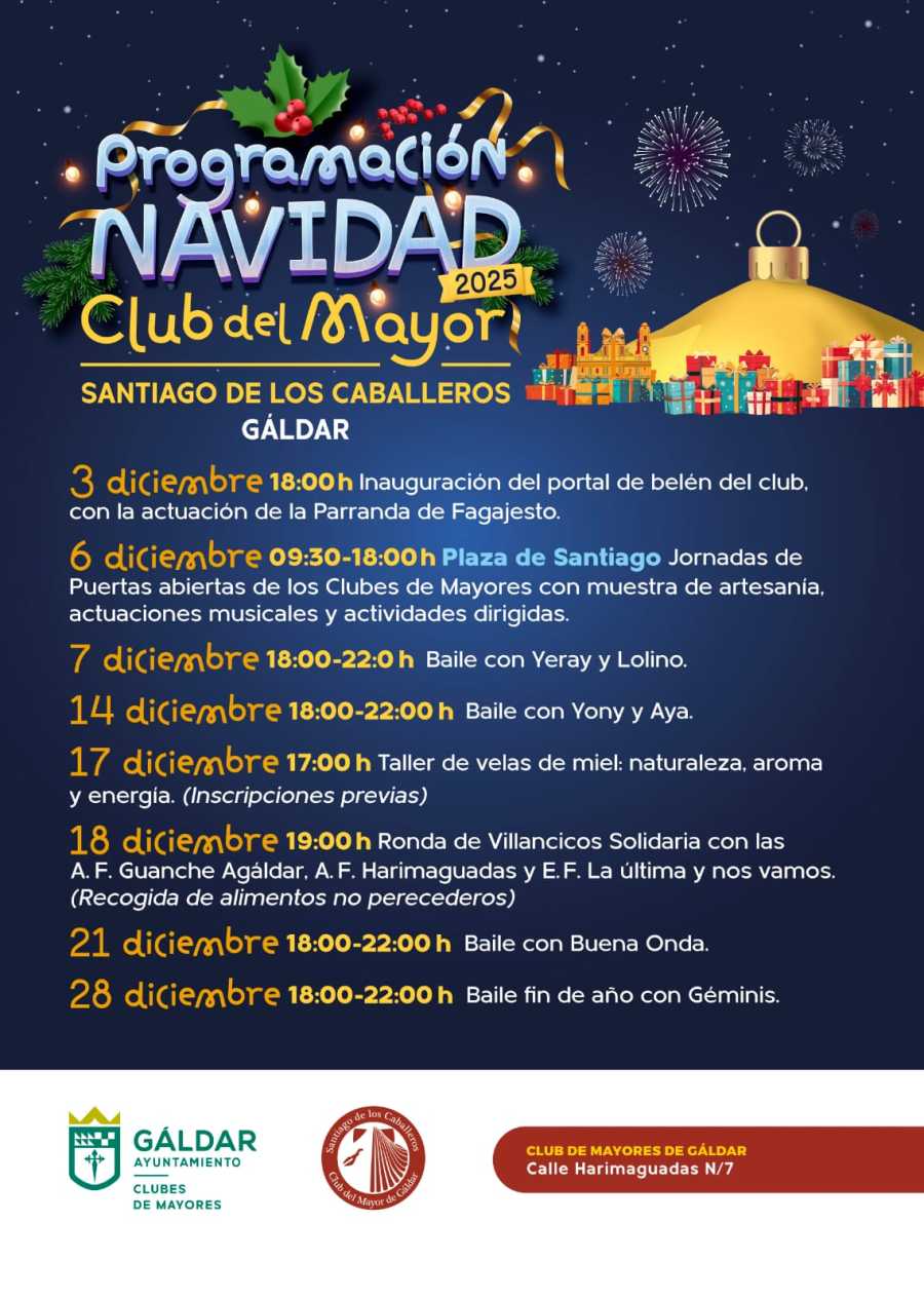 Paralelamente, en el Club Santiago de los Caballeros, las actividades arrancaron desde este miércoles, 3 de diciembre, con la inauguración de su portal de belén, con la actuación de la Parranda de Fagajesto. Este domingo 7, el baile con “Yeray y Lolino” abrirá la semana festiva, seguido del baile con “Yony y Aya” el domingo 14. El miércoles 17, se impartirá el mismo taller de velas de miel, con inscripción previa. El jueves 18, la Ron-da de Villancicos Solidaria reunirá a las agrupaciones folclóricas Guanche Agáldar, Harimaguadas y La Última y Nos Vamos, con recogida de alimentos. El domingo 21, el baile con “Buena Onda” animará la jornada, y el programa finaliza el domingo 28 con el Baile Fin de Año con “Géminis”.