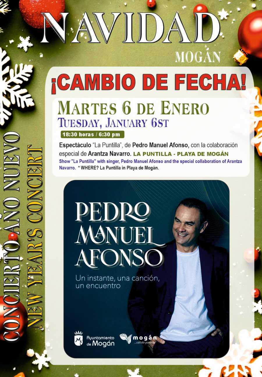 El Ayuntamiento de Mogán, en vista de la elevada probabilidad de lluvias el jueves 1 de enero, ha decido posponer el concierto de Año Nuevo de Pedro Manuel Afonso al martes 6 de enero. De esta forma, se garantiza que el evento se celebre en las mejores condiciones posibles y el disfrute de las personas asistentes.