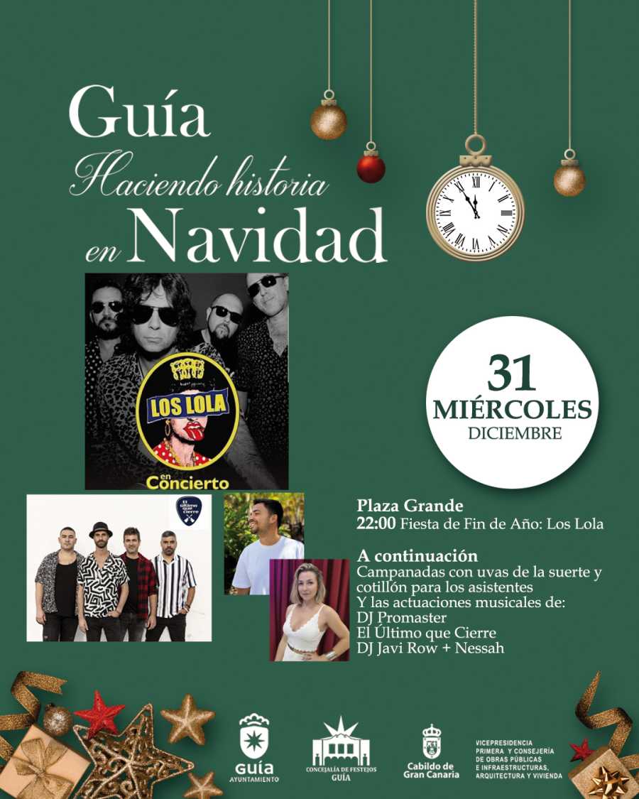 Guía tiene todo listo para dar la bienvenida al Nuevo Año 2026 por todo lo alto. La Plaza Grande de la ciudad será el escenario de la gran fiesta de Fin de Año que se celebrará mañana miércoles, una cita que arrancará a las 22:00 horas con la actuación del grupo Los Lola. Será una noche festiva marcada por la buena música y el gran ambiente,  donde  no faltarán las uvas y el cotillón, que se repartirán para que vecinos y visitantes puedan recibir el nuevo año de manera festiva y compartida, siguiendo las campanadas del reloj de la Iglesia de Santa María de Guía, uno de los momentos más esperados de la noche.
