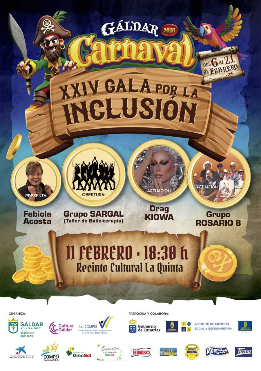 El Ayuntamiento de Gáldar y la Asociación COMPSI, organizan la XXIV GALA POR LA INCLUSIÓN, en el Recinto Cultural La Quinta, junto al Pabellón Vega Mateo, el miércoles 11 de febrero de 2026 a las 18:30 horas.