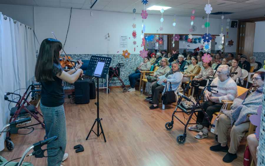 Durante la sesión, el grupo también disfrutó de una actividad de relajación guiada por alumnas en prácticas del centro, que recrearon ambientes sonoros de playa y bosque. La jornada concluyó con un juego para adivinar quién canta populares temas del cancionero nacional y con varias piezas musicales interpretadas por la profesora de violín de las Escuelas Artísticas de Mogán, Sandra Vigil.