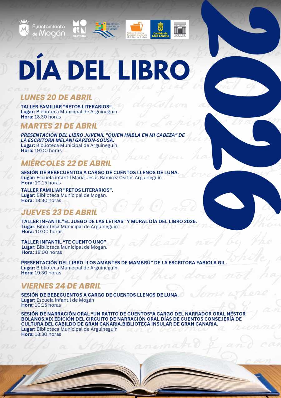 La jornada del miércoles 22 de abril comenzará con una sesión de bebecuentos a cargo del grupo Cuentos Llenos de Luna, que se celebrará a las 10:15 horas en la Escuela Infantil Municipal María Jesús Ramírez Ositos, en Arguineguín. Por la tarde, la actividad “Retos literarios” se trasladará a la Biblioteca Municipal de Mogán, a partir de las 18:30 horas.