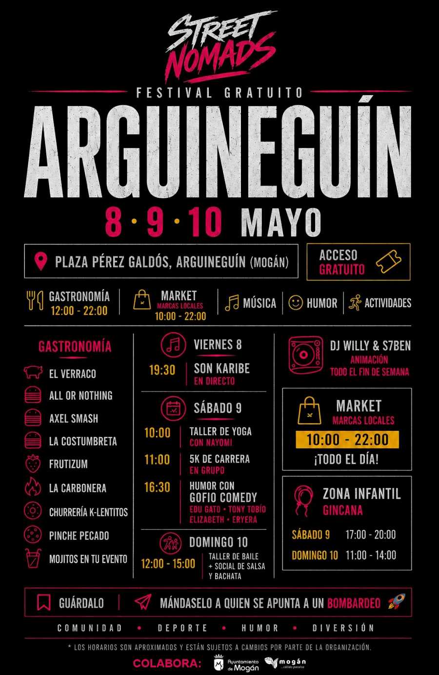 La Plaza Pérez Galdós de Arguineguín será el escenario de la segunda edición del Street Nomads, un festival gratuito que se celebrará los días 8, 9 y 10 de mayo, reuniendo gastronomía, música, humor, deporte, actividades familiares y un mercado de marcas locales. El evento, de iniciativa privada, cuenta con la colaboración del Ayuntamiento de Mogán y está abierto a toda la ciudadanía.
